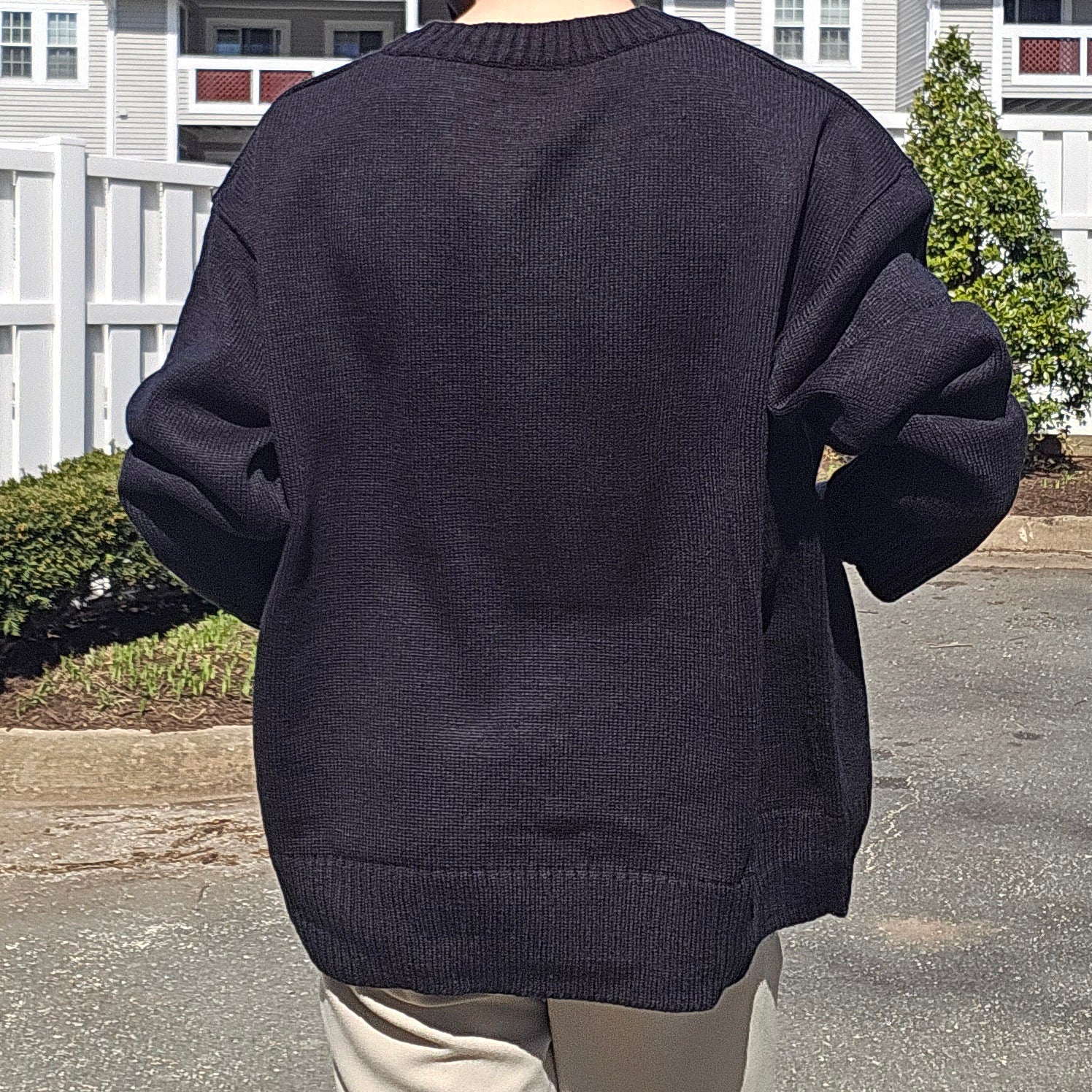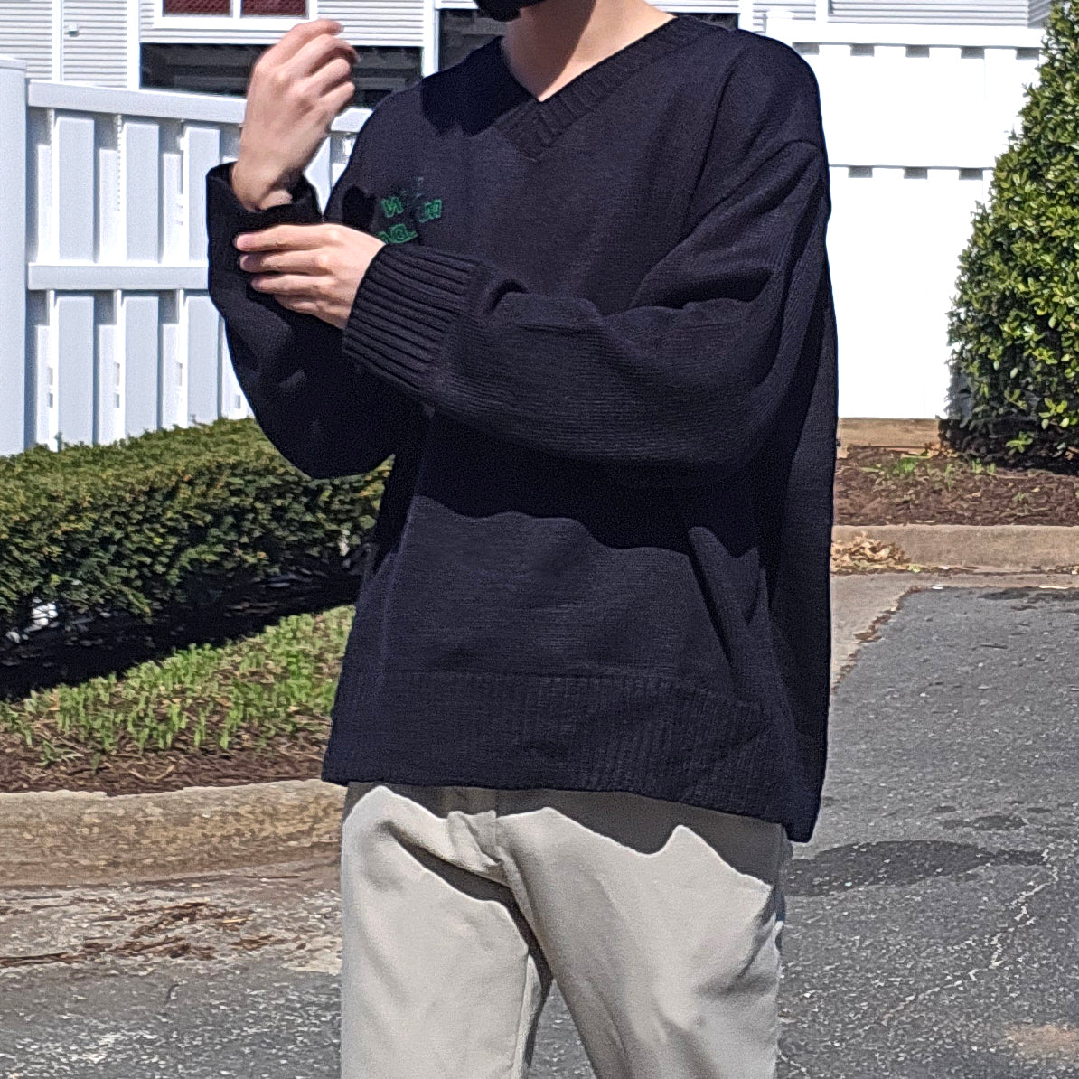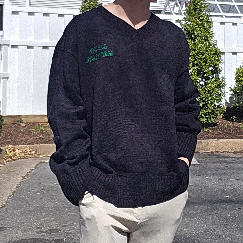 편안한 브이넥과 탄탄한 니트짜임이 있는 니트 웨어이며, 루즈한 핏을 연출하기 좋습니다.